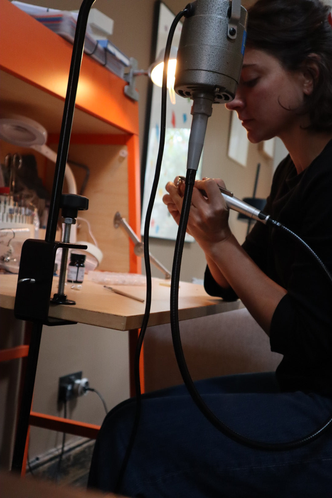 Every jewel is designed by Mireia in her London studio. Sometimes pieces are finished by a trusted manufacturing supplier based in the UK. We work closely with local suppliers for ethical gemstones, casting, metals, stone setting and tools.