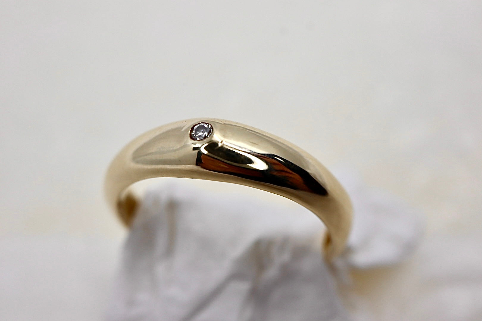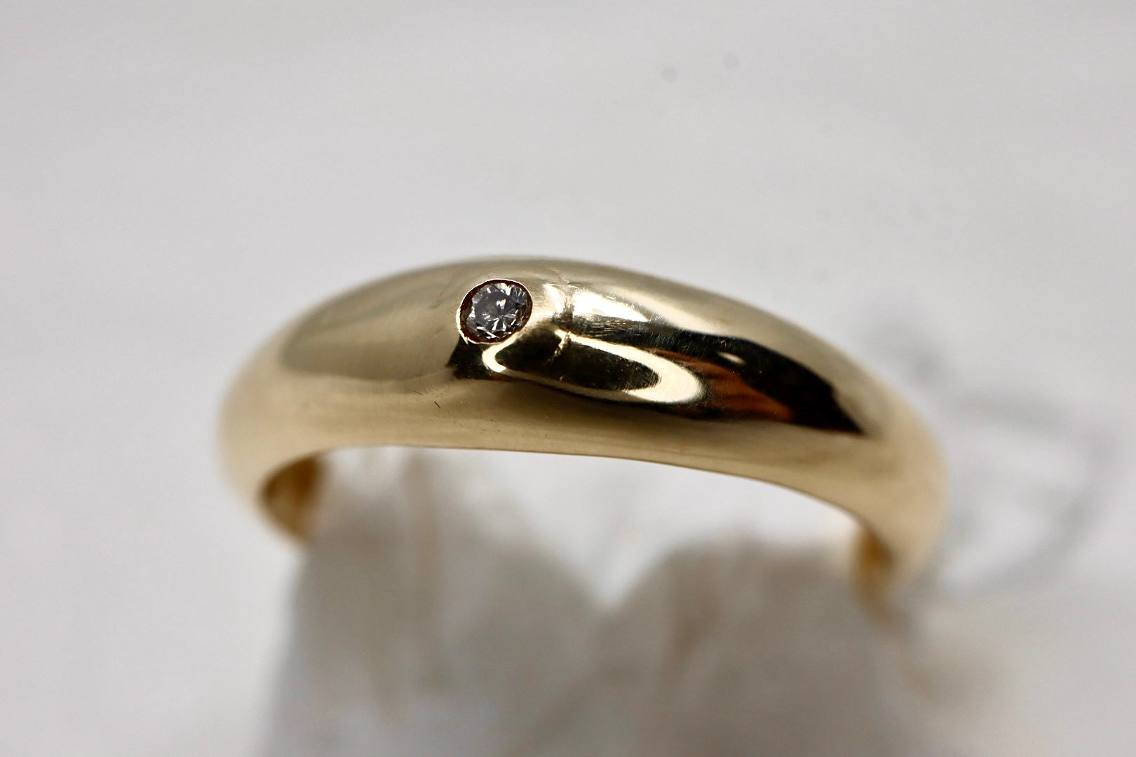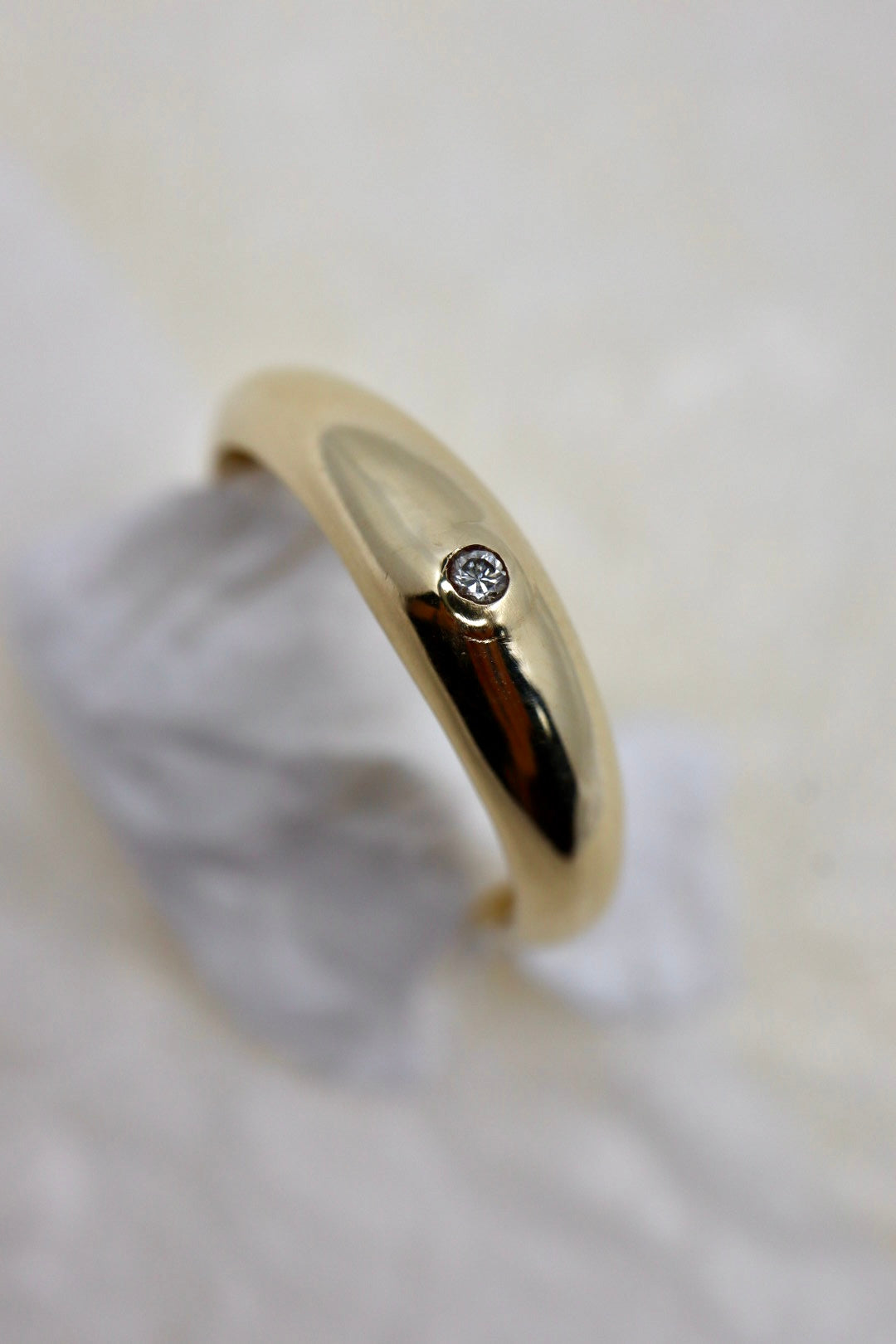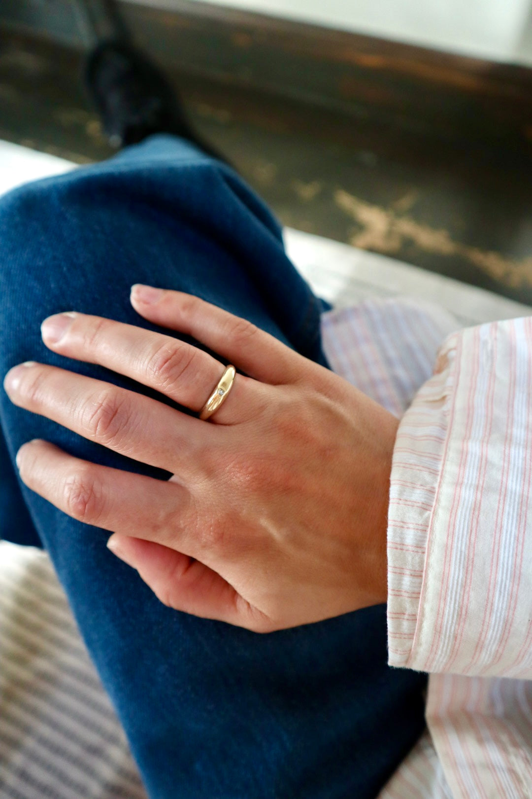 A modern classic. The Diamond Dome is crafted in 9k solid gold with a flush-set diamond that sits securely within the band. Designed to be durable, snag-free, and timeless, this ring balances bold minimalism with everyday practicality.
