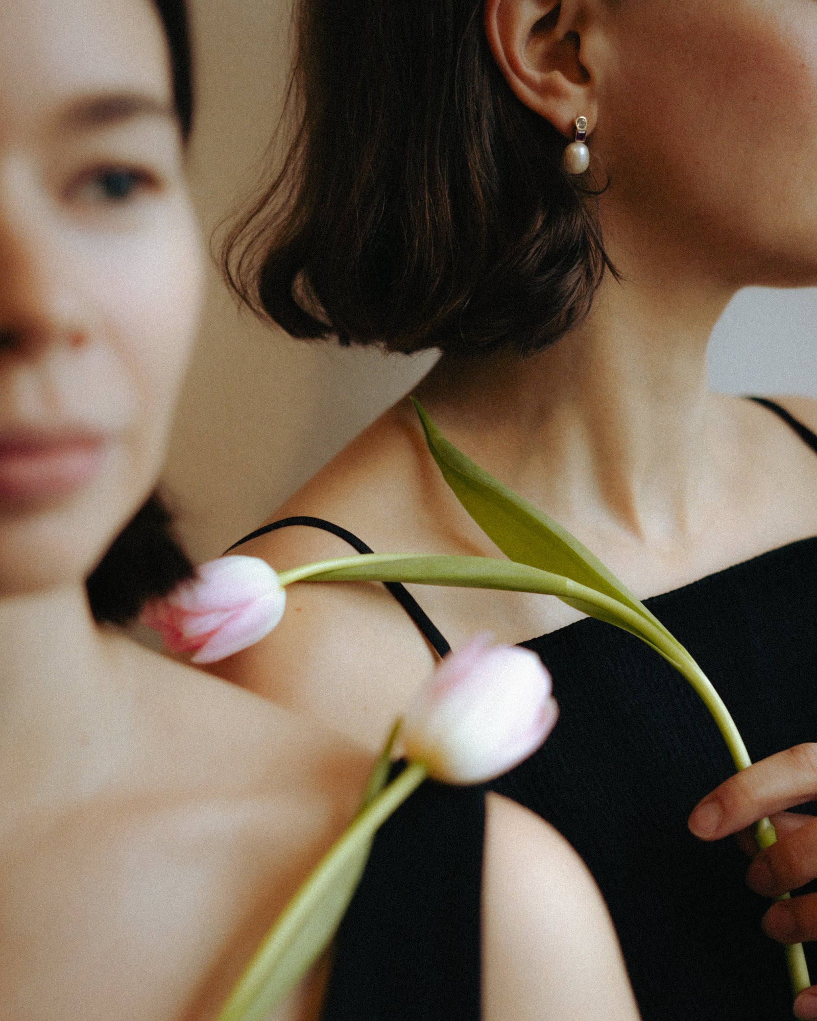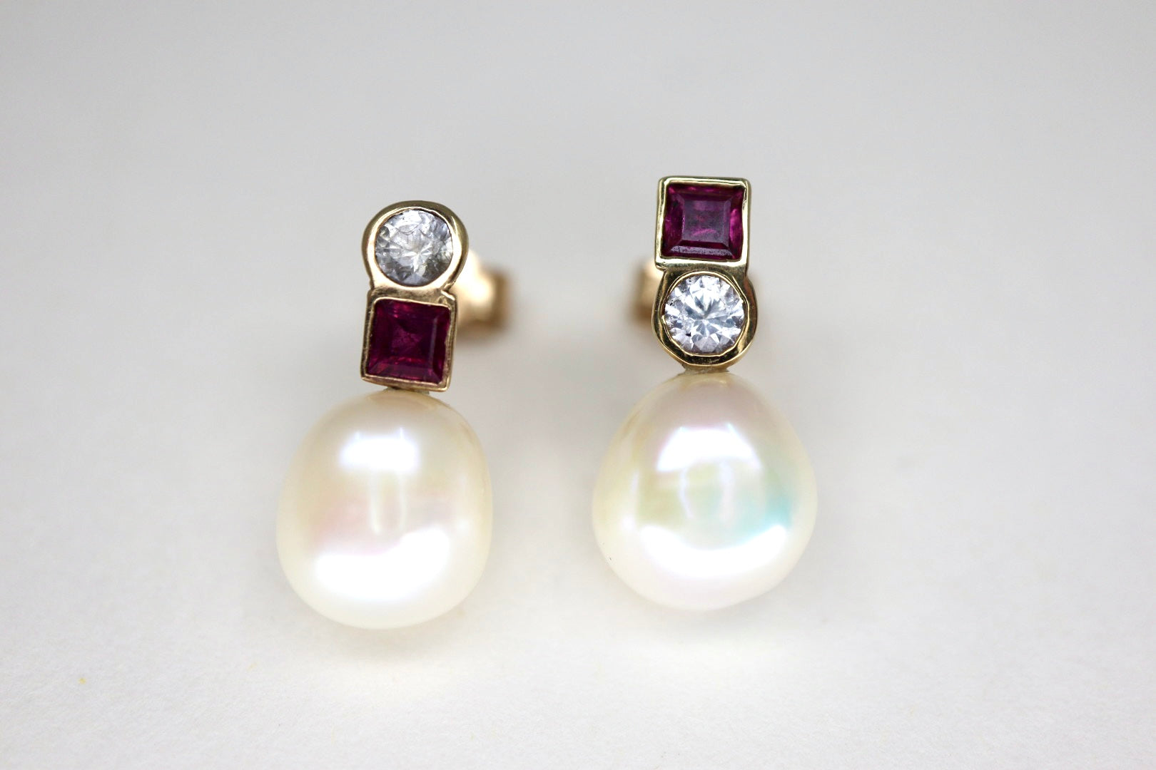 Solid gold studs with a round lab-grown diamond and a square ruby in 9k gold, finished with a luminous natural pearl. One earring features the ruby above the diamond, the other the diamond above the ruby, a subtle, playful asymmetry.
